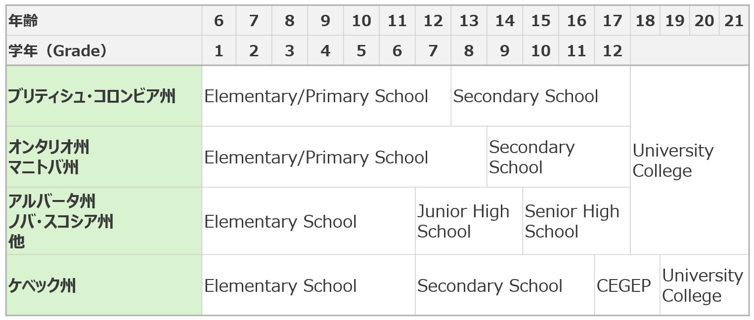 ちなみにアルバータ州・ノバスコシア州は、日本と同じ学年の区分けという事になります。(小学校6年間、中学3年間、高校3年間)