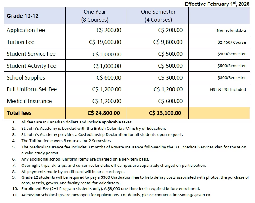 SJA VancouverはGrade 10〜12を対象とした学校のため、Grade 9以下の生徒は対象外です。中学生からの留学を検討されている場合は、他の学校をご紹介します。お気軽にご相談ください。